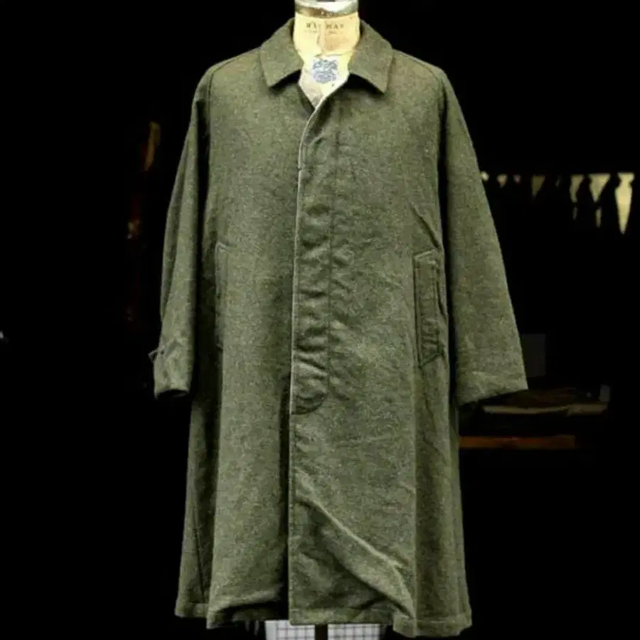 프랑스제 빈티지 발마칸 코트를 베이스로 한 모델입니다. 겉감에는 LOVAT사의 21oz 헤비 웨이트 트위드를 사용했습니다. LOVAT는 스코틀랜드에서 100년 이상의 역사를 가진 밀(Mill)입니다. 전쟁 중에 자연색을 섞어 만든 다채로운 카키색 카모플라쥬 트위드를 만들어 군복으로 사용되었습니다. 그 LOVAT 오리지널 멜란지 컬러를 사용하여 제작된 21oz 헤비 웨이트 트위드를 사용하고 있습니다. 디자인은 1피스 래글런 A라인 코트이지만, 래글런 커팅이 특징적이며 어깨 주변의 실루엣을 깔끔하게 만들었습니다. 무쌍용으로 만든 패턴을 어레인지하여, 인버티드 코트처럼 안감에 레인보우 색상의 코튼 개버딘을 배치했습니다. 최종 공정에서 제품에 워싱을 하여 의도적으로 주름감을 주었습니다. 원단이 릴랙스하여 부풀어 올라 매우 고급스럽고 박력 있는 코트로 완성되었습니다.