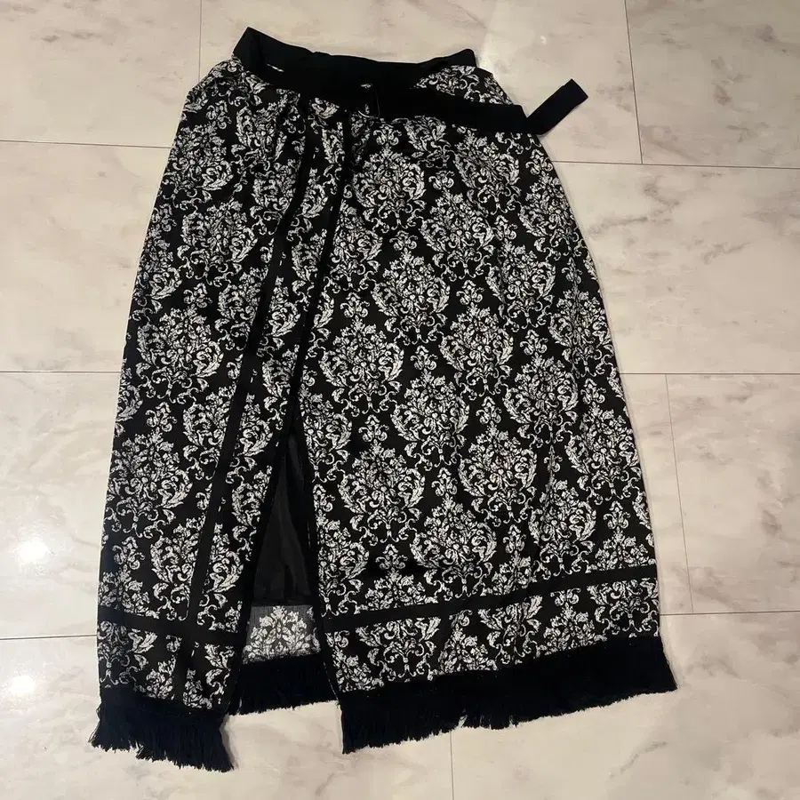 다마스크 무늬 프린지 부착 롱 스커트