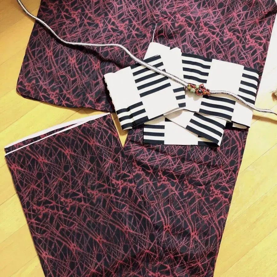 앤티크 순수 실크 코몬 블랙에 스칼렛 라인 기하학 패턴