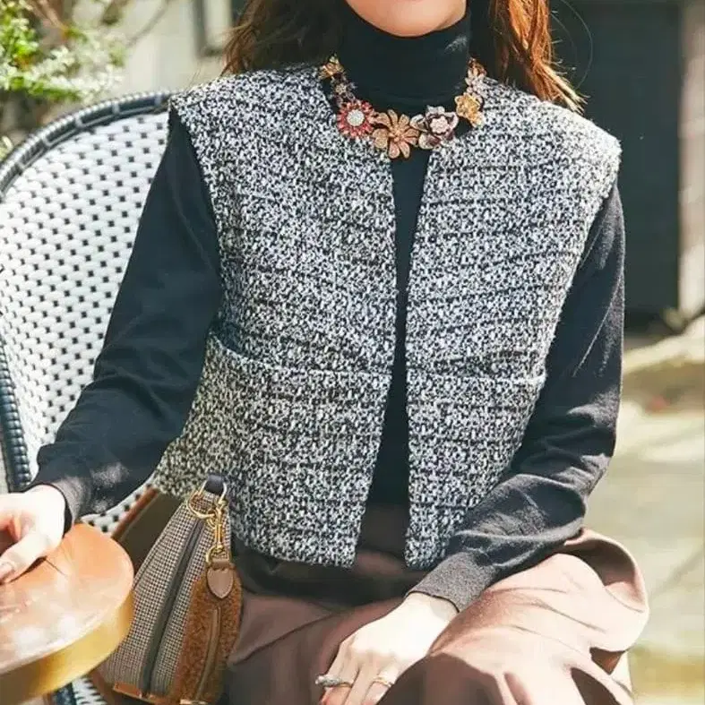 화려한 믹스 트위드를 럭셔리하게 사용한 스타일링의 주인공이 되는 베스트.