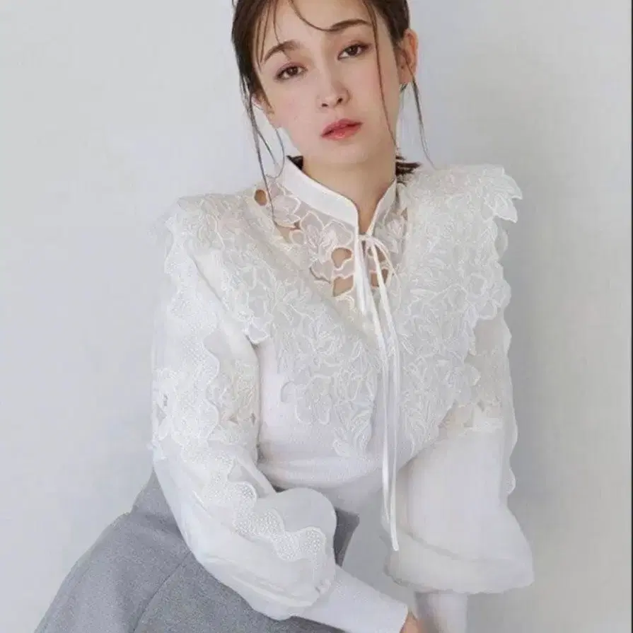 코다와리 플라워 모티브 자수를 고급스럽게 더한, 화려한 니트 풀오버입니다. 자수에는 포인트로 코드 자수를 MIX하여 리듬감 있게 마무리했습니다. 새틴 파이핑에서 이어지는 듯한 가느다란 리본도 돋보이는 악센트가 됩니다. 카라와 소매는 비침이 있는 오간자 소재로 절개하여, 봄다운 가벼움을 이미지했습니다. 한 장만으로도 존재감이 충분한 기술이 들어간 니트는 심플한 미니 스커트와 궁합이 좋습니다.