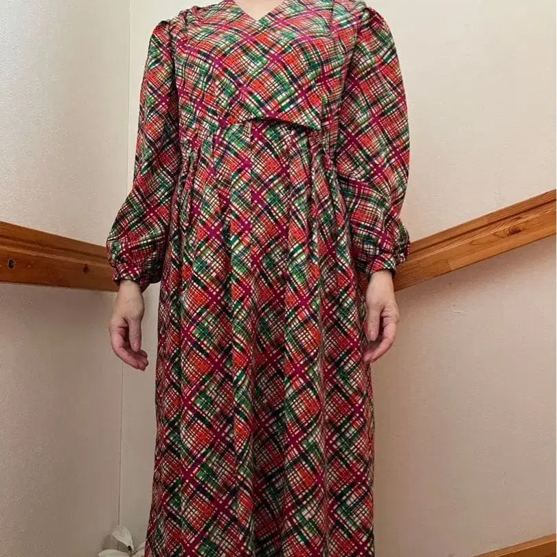 쇼와 레트로 원피스 빨간색 오렌지 체크 무늬 L 상당 긴팔 어깨 패드