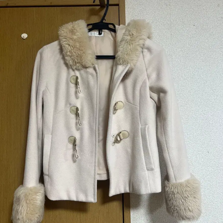크림색 퍼 달린 더플 코트
