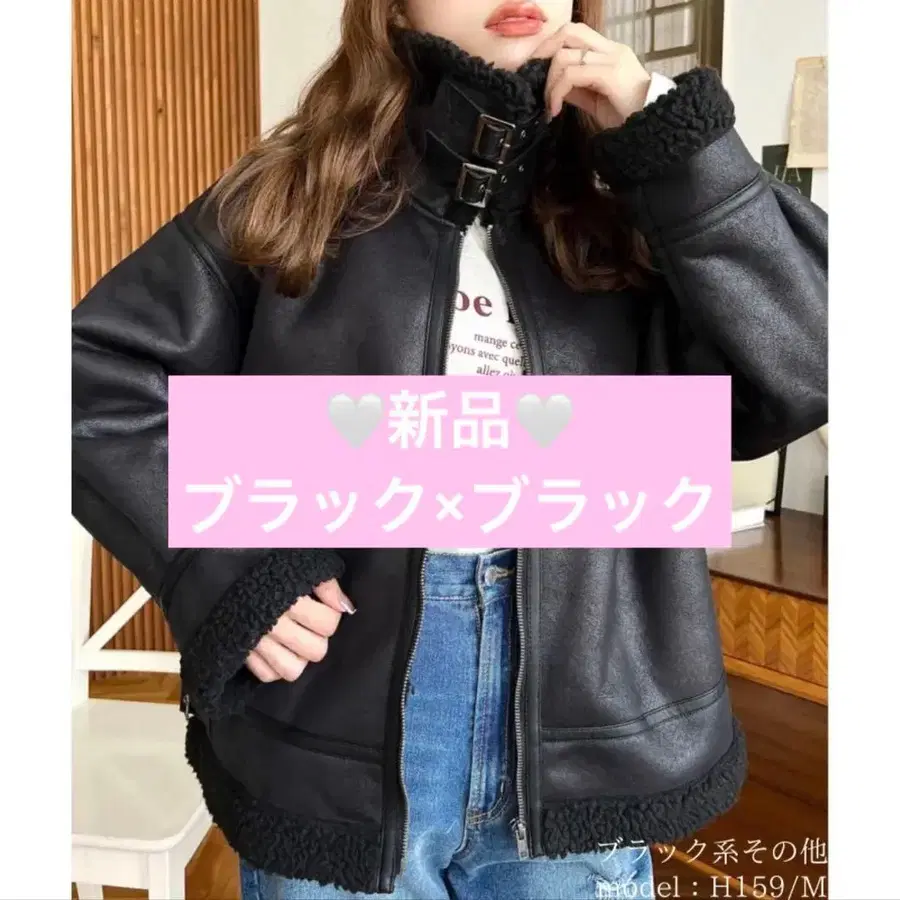 트렌디한 레더 장식과 리얼한 표면감이 특징인 페이크 레더 x 보아 플라이트 재킷.