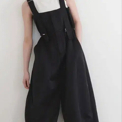 스트랩이 달린 블랙 살로펫, 넉넉한 실루엣으로 쾌적한 착용감.