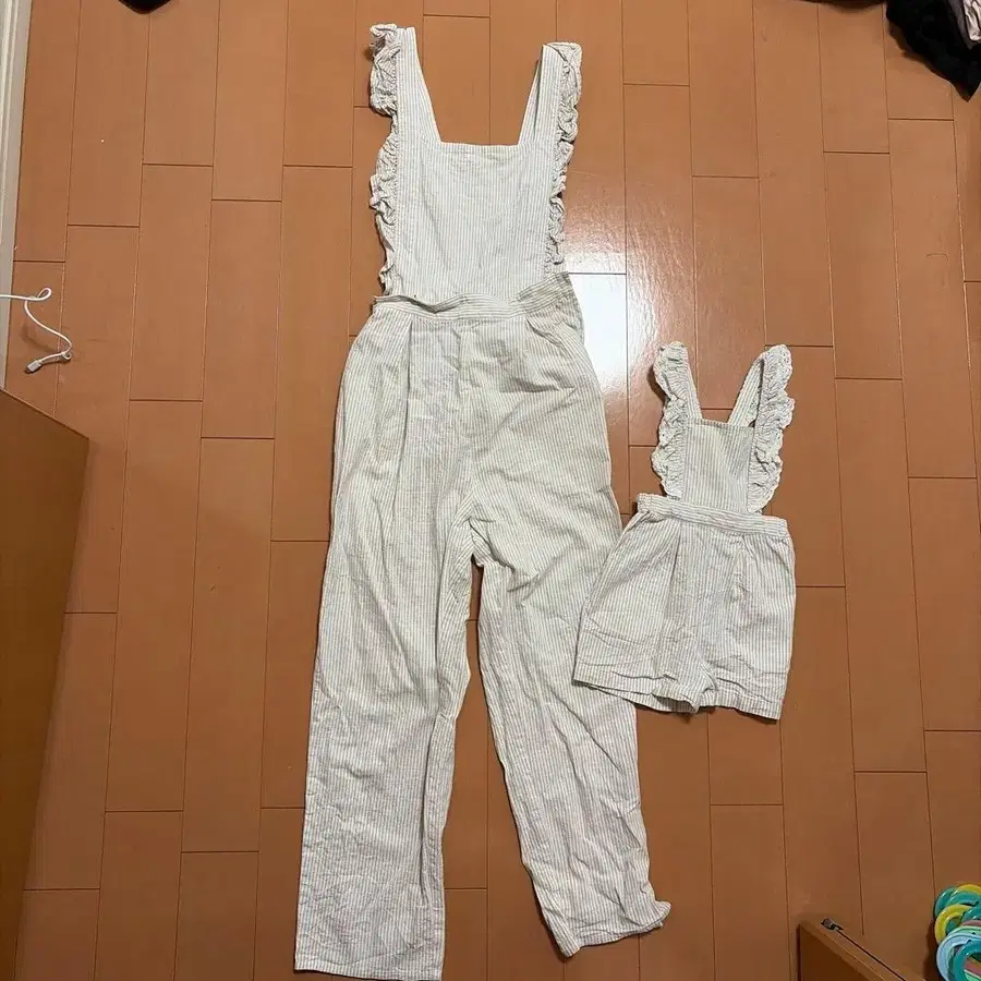 쁘띠마인리아 친자 커플 프릴 달린 스트라이프 오버롤 세트