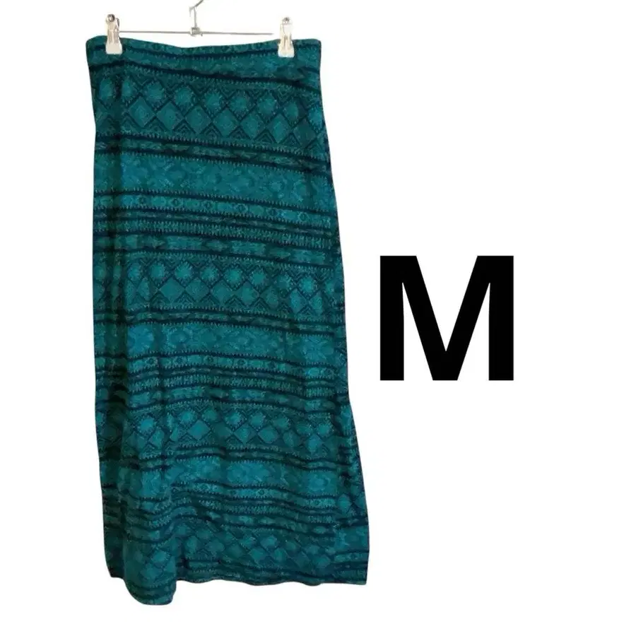 자동 번역되었어요. 원문보기기하학 패턴의 터콰이즈 롱 스커트, 폴리에스테르와 스판덱스 혼합 소재로 쾌적한 착용감.