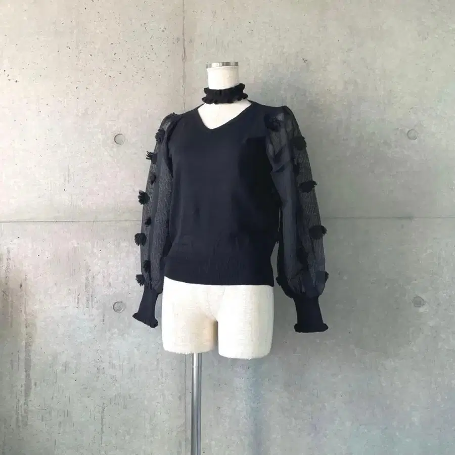 택 포함 새상품 초커 포함 폼폼 시어 슬리브 니트 블랙 M