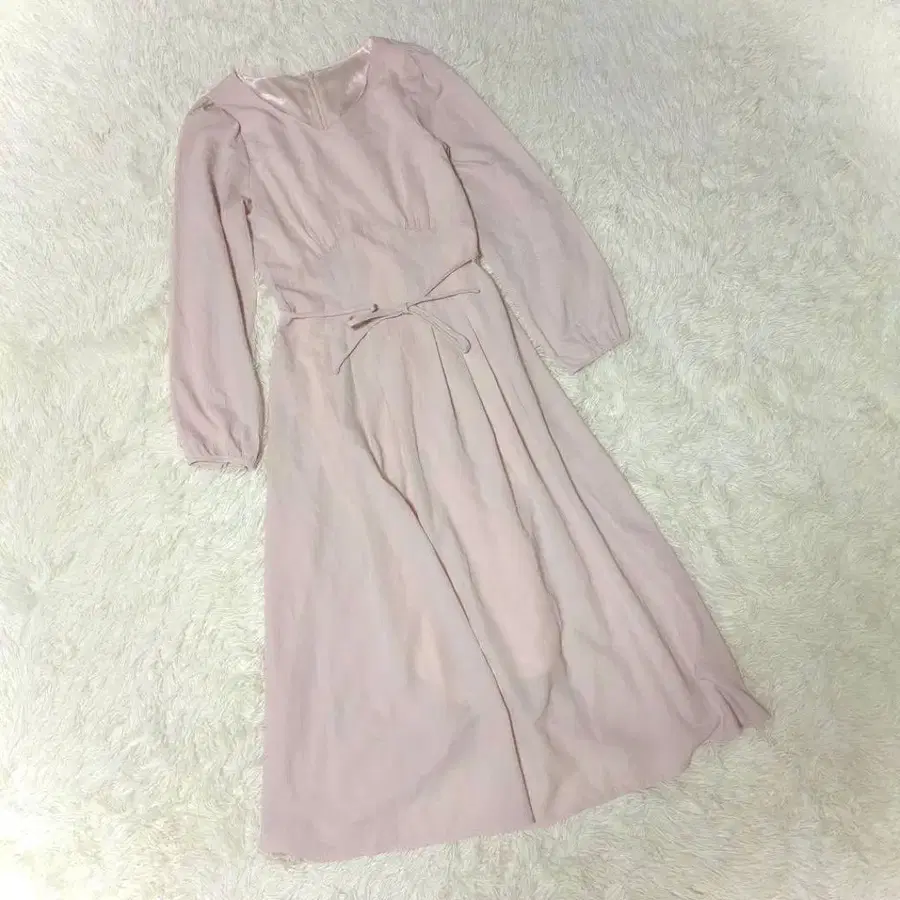 [ 새상품급 ] 안감 부착된 V넥 긴팔 롱 원피스입니다. 부드러운 옅은 핑크색 (페일 핑크/벚꽃색) 색감이 여성스러우며, 허리 리본으로 스타일업 효과도 있습니다. A라인 실루엣으로 고급스러운 인상을 줍니다. 봄이나 가을 외출, 데이트에도 딱입니다. 페미닌한 분위기를 원하시는 분께 추천합니다.
