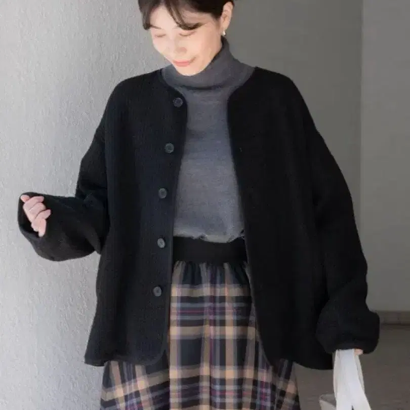 가을 아우터로는 물론, 코쿤형 암 디자인도 넉넉하여 볼륨 슬리브나 니트 위에도 쉽게 겹쳐 입을 수 있으며, 계절이 깊어진 후에도 겉옷으로 활용하기 좋습니다.