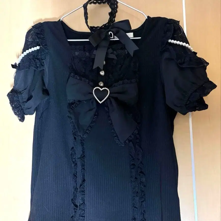 LIZLISA 리즈리사 크로스 레이스 리본 컷 반팔 상의 블랙
