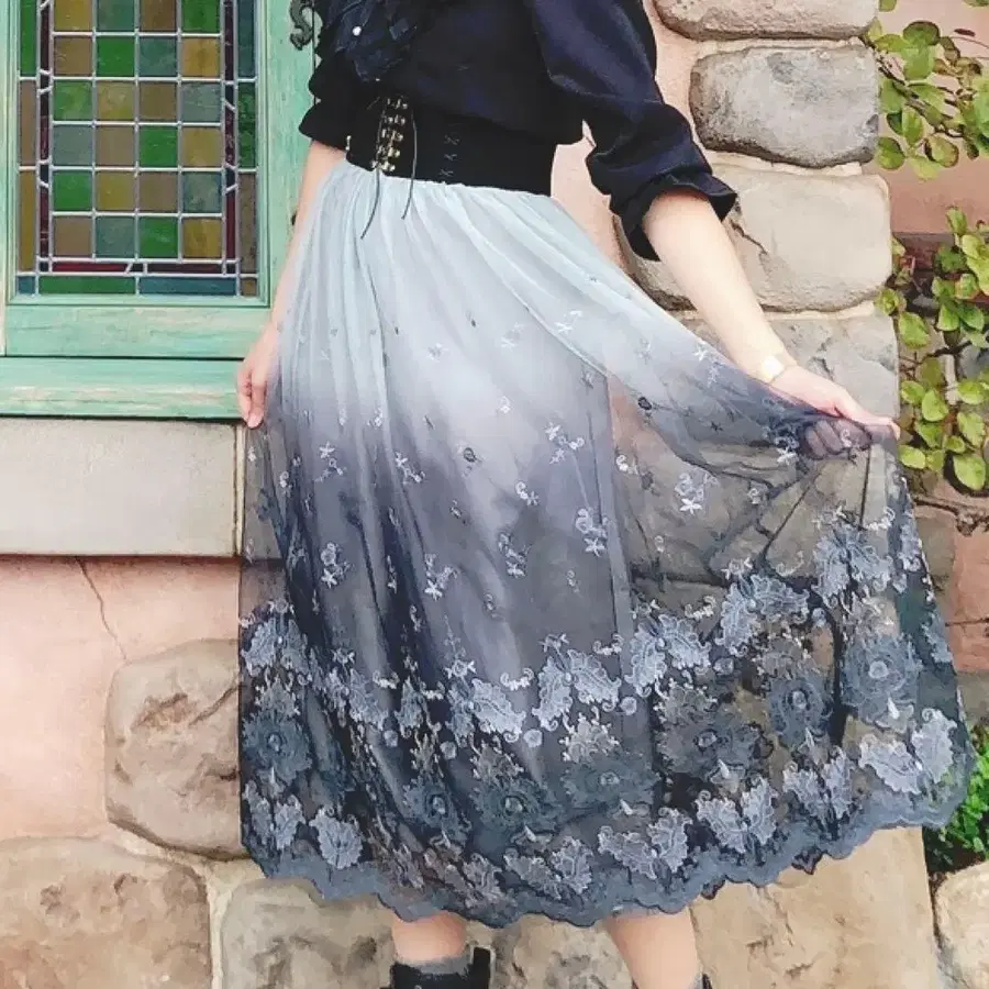 엑시즈팜 그라데이션 튤 플레어 스커트 자수 그린