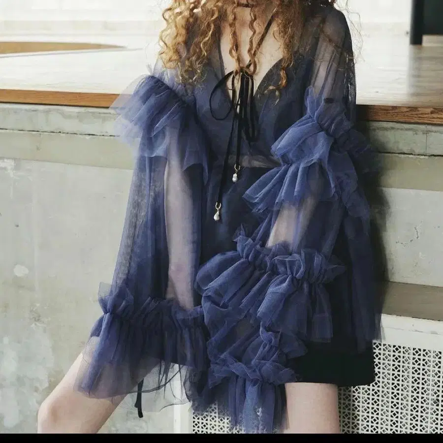 라벨에튀드 V넥 볼륨 개더 튤 상의
