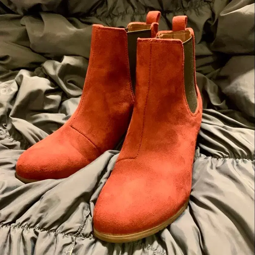 스웨이드 느낌의 버건디 컬러 사이드 고어 부츠, 캐주얼 스타일에 최적.