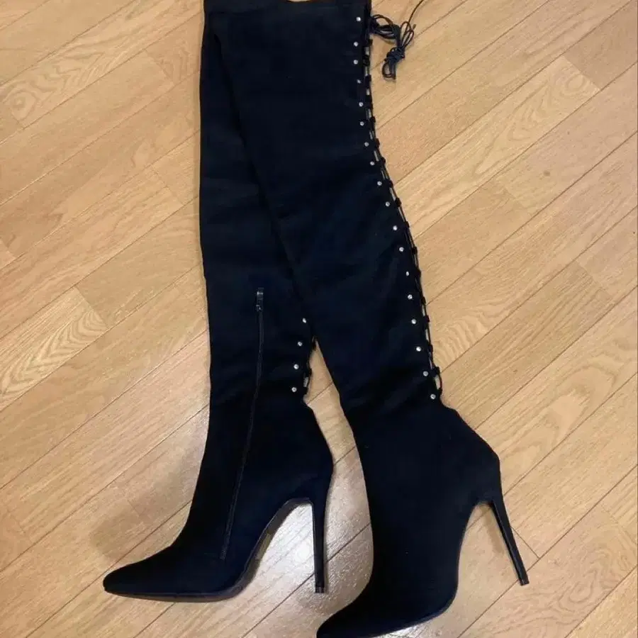 블랙 스웨이드 니하이 부츠 하이힐 레이스업