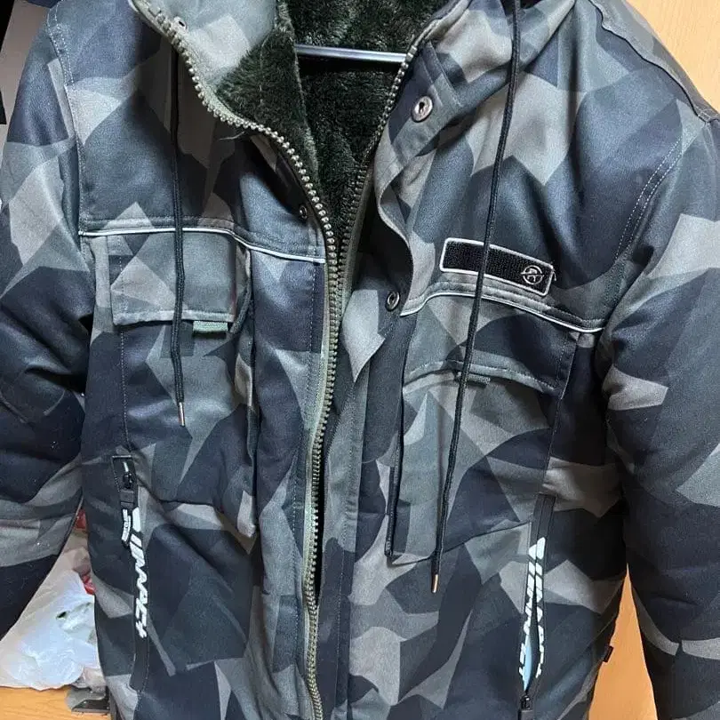 카모 패턴 패딩 자켓 후드 부착 보아 안감 방한 겨울 아우터