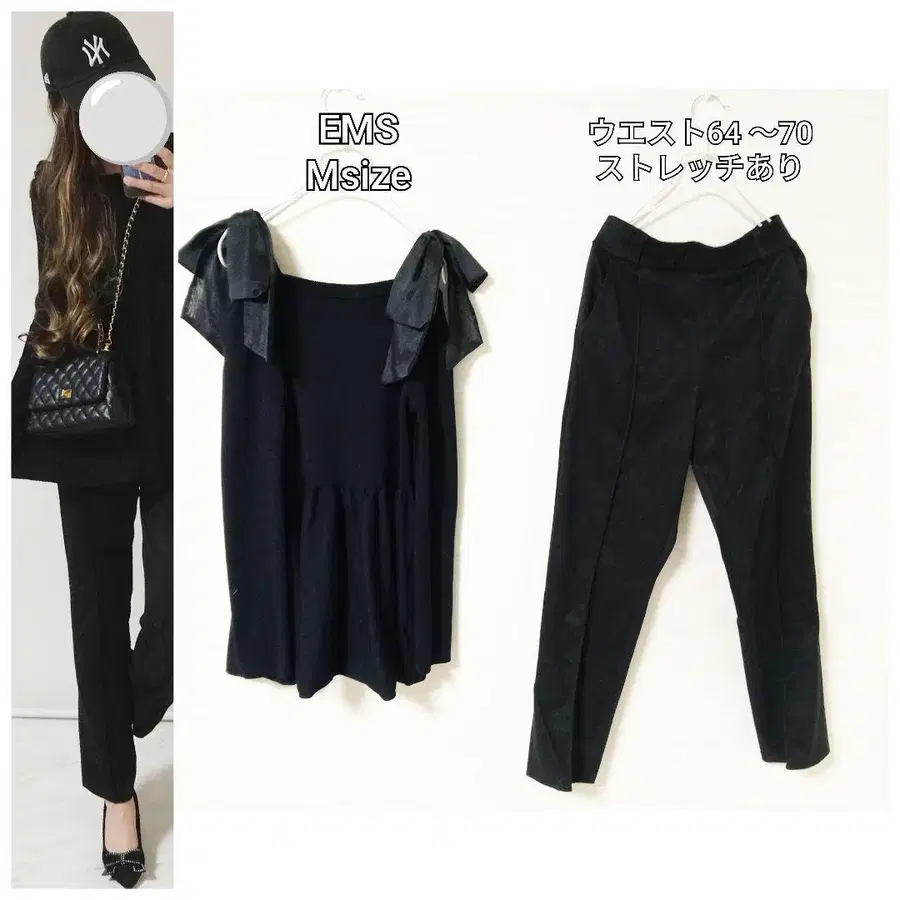 코디 세트 어깨 리본 페플럼 니트 센터 프레스 팬츠