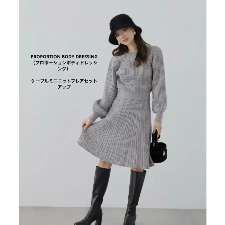 리브 디자인의 그레이 니트 셋업, 벌룬 슬리브 스웨터와 무릎 위 기장 스커트의 조합.