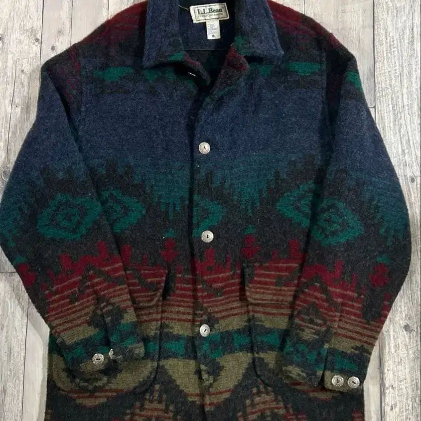 L.L.Bean 네이티브 무늬 울 자켓입니다. 귀한 USA제입니다. 콤초 버튼이 멋진 아이템입니다. 상태는 데미지 없이 양호합니다. 사이즈 L 가슴 너비 60cm 어깨 너비 52cm 기장 80.5cm 소매 길이 66cm