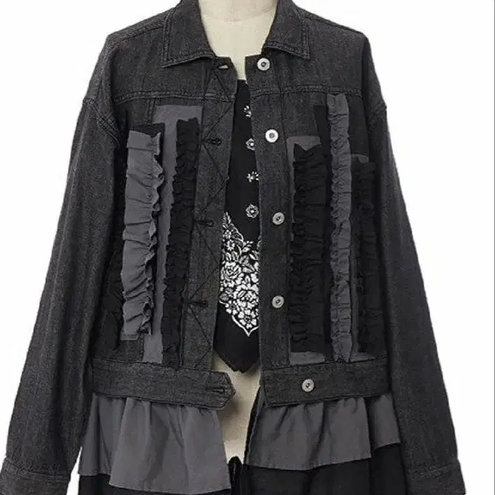 프릴이 달린 다크 그레이 색상의 데님 자켓으로, 레이어드 스타일이 특징적입니다.