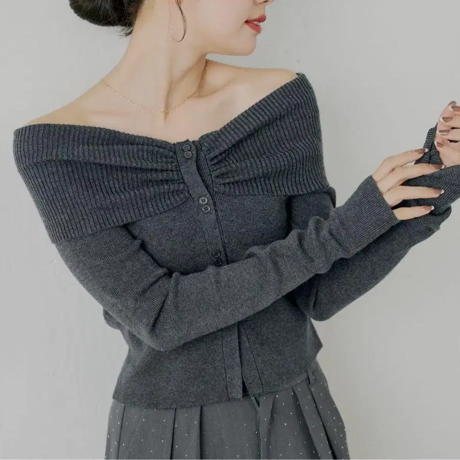Chico 프론트 버튼 오프숄더 니트 차콜 그레이