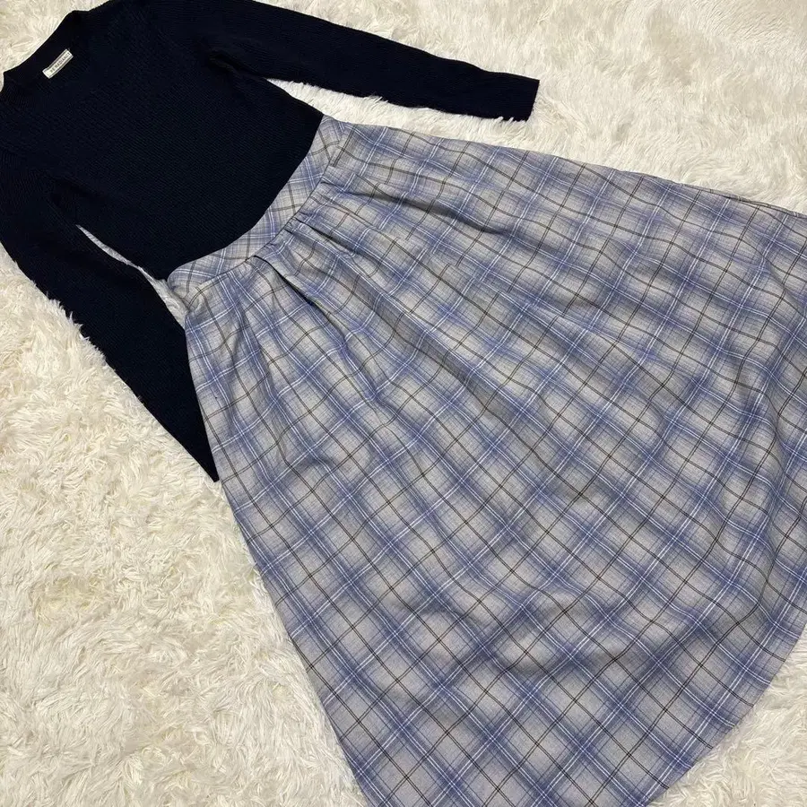 새상품급 네이비 체크 무늬 플레어 스커트 롱 원피스