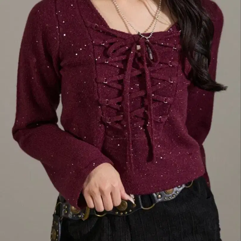 가슴 부분의 레이스업 디자인이 인상적인 라메 믹스 니트.