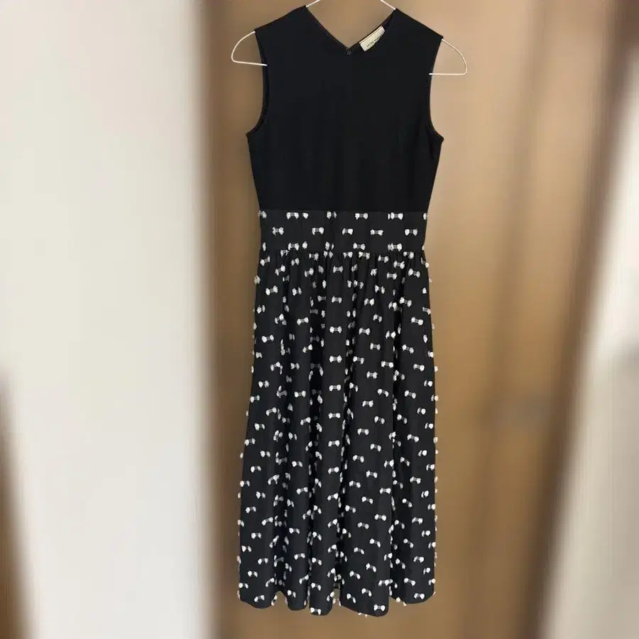 답답한 라운드와 뒷면 V넥 넥라인, 슬리브리스 디자인으로 한여름까지 착용하기 좋은 원피스.