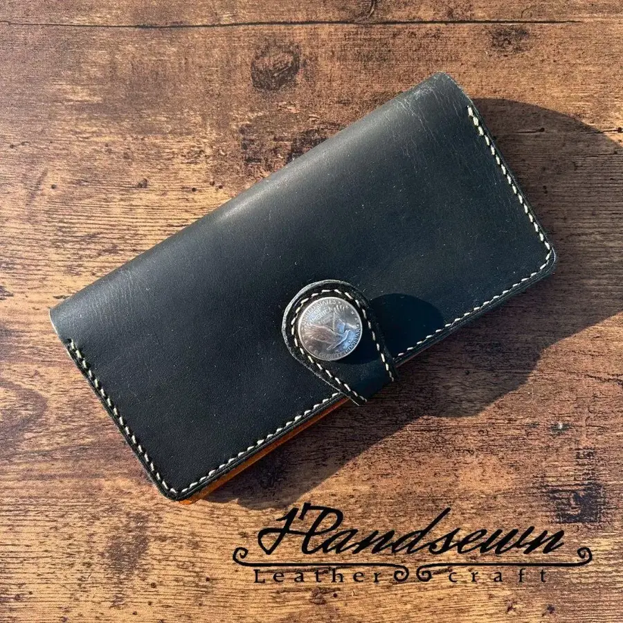 봐주셔서 감사합니다. 이 상품은 블랙과 카멜 색상의 가죽을 사용하여 제작한 장지갑입니다! 외부는 블랙 색상의 소가죽으로 되어 있습니다. 내부는 카멜 색상의 새들 레더를 사용하여 매우 고급스럽습니다. 현품 한정으로 하나뿐인 상품입니다. 앞쪽에 동전 지갑을 달아 크게 열어 내용물을 보기 쉽게 하였습니다. 동전 지갑, 지폐 수납 공간, 카드 포켓 등 심플한 구조이지만 카드 포켓은 5개로 수납력이 뛰어납니다! 제작은 재단, 봉제 모두 수작업으로 미싱을 사용하지 않고 한 땀 한 땀 정성스럽게 손바느질로 완성하였습니다. 사이즈 세로 9.5cm 가로 18cm 폭 2cm 이는 어디까지나 참고치이므로 상품에 따라 약간의 오차가 있을 수 있습니다. 양해 부탁드립니다. 가죽 제품은 천연 소재이므로 상품에 따라 주름의 표현이 다르거나 미세한 흠집 등이 있을 수 있습니다. 컴초가 달린 상품의 컴초는 나사로 고정되어 있습니다. 사용 중에 나사가 풀릴 수 있으니 주기적으로 다시 조여 주시기 바랍니다. 장지갑 트래커 월렛 라이더스 그린 미들 #17handsewn
