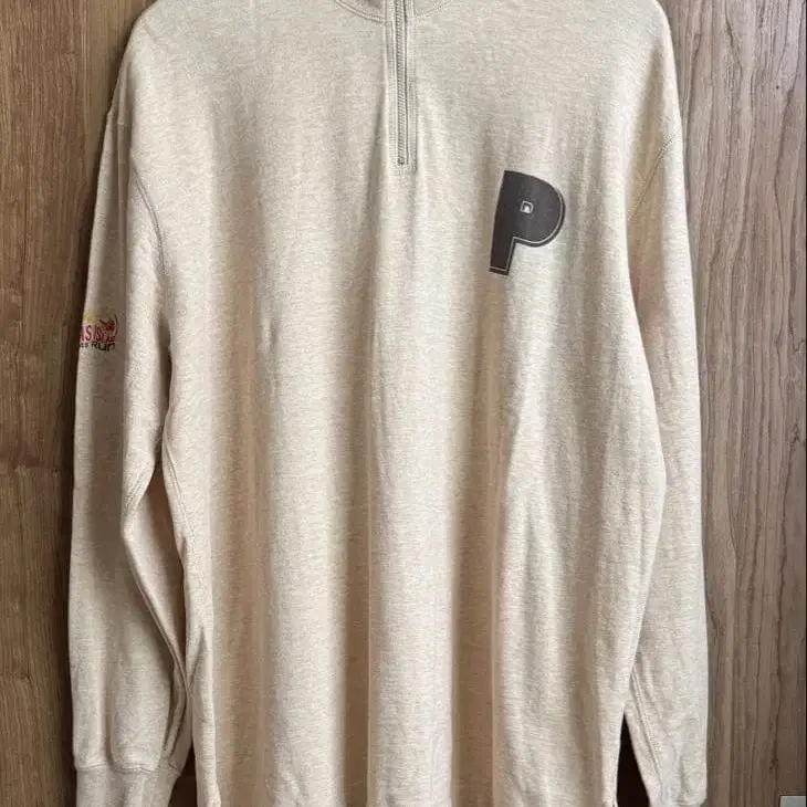 하프 지퍼 디자인의 베이지색 트레이닝복, P 로고, 소매에 PAPAS 로고 포함.