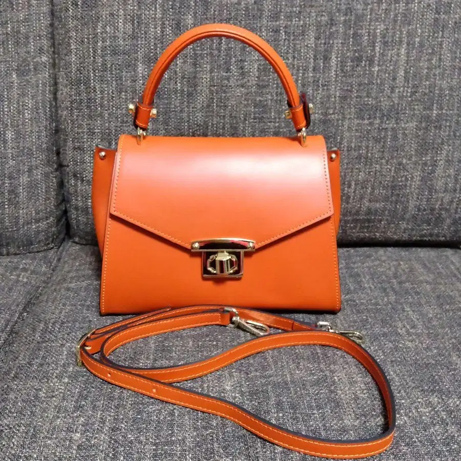 자동 번역되었어요. 원문보기오렌지 색상의 가죽 숄더백, 플랩 디자인, 숄더 스트랩 포함.