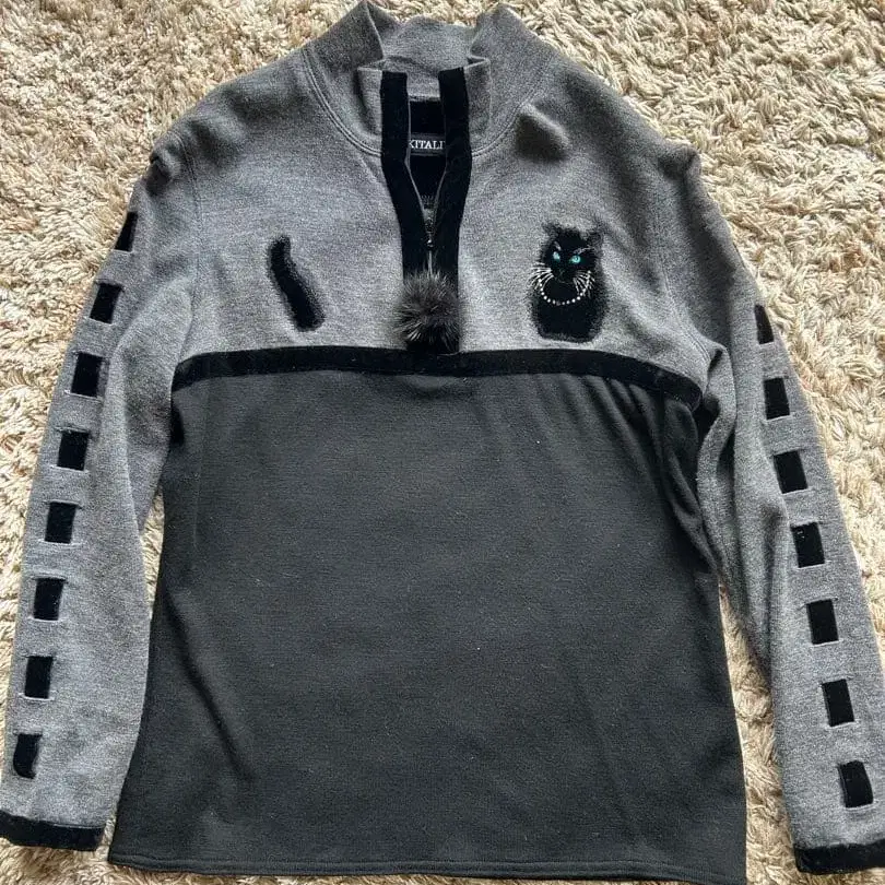 ☆ 가슴에는 검은 고양이 모티브의 자수가 놓여 있으며, 목걸이에 큐빅 비쥬 장식, 눈에도 반짝이는 스톤이 ♡ 털 모양도 재현한 입체 자수가 본격적이고 손이 많이 간 일품입니다. 지퍼 탭에 부속되었던 둥근 퍼는 탈부착하여 보관. 다시 묶어서 달아주세요.