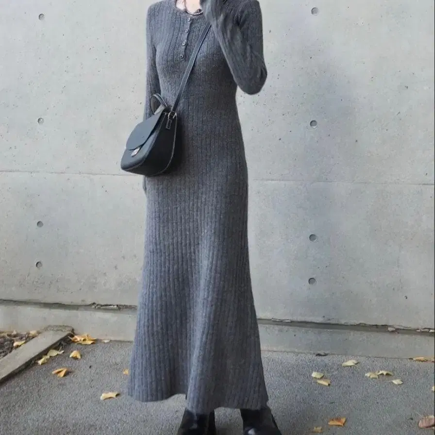 새상품 LAULEN 헨리넥 롱 리브 원피스 차콜 그레이