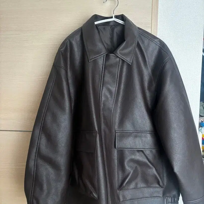 GU 다크 브라운 가죽 박스 실루엣 자켓