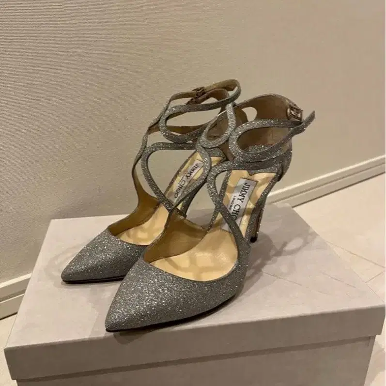글리터 소재의 실버 하이힐, 스트랩 디자인으로 포멀한 장면에 최적.