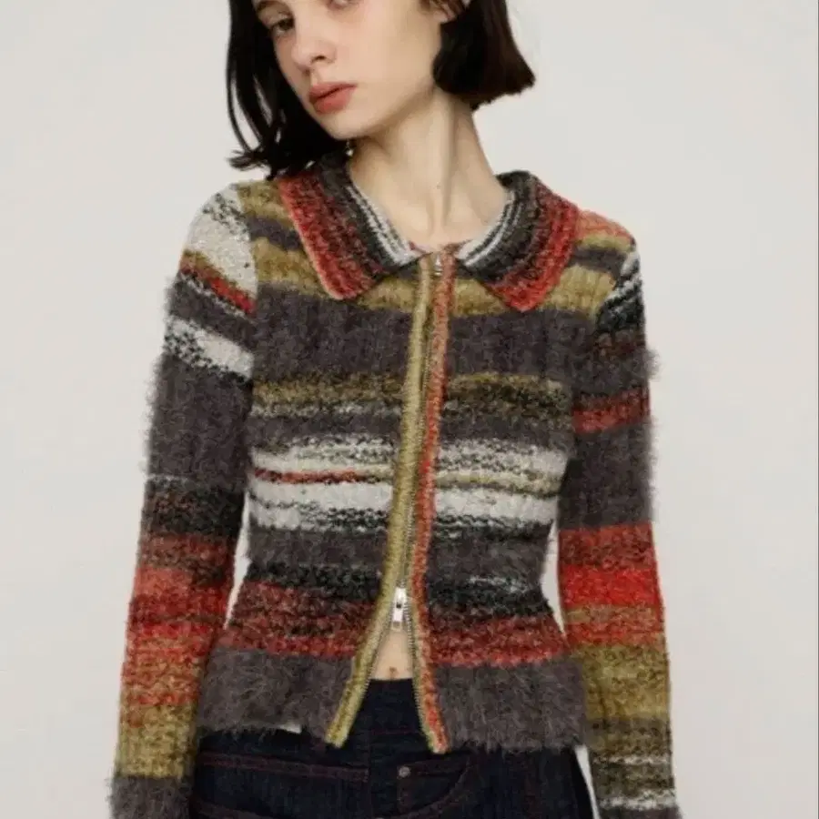 믹스 컬러 실과 샤기 실을 랜덤 보더로 마무리하여 표정이 풍부한 집업 니트.
