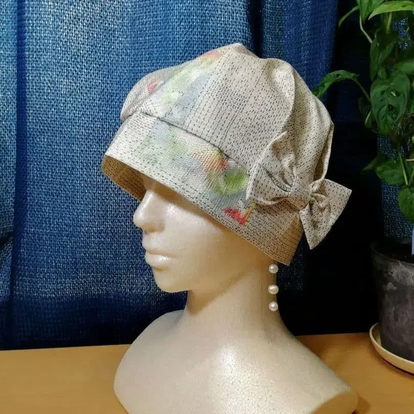 오시마 명주 비니 모자 리본 포함 베이지 핸드메이드