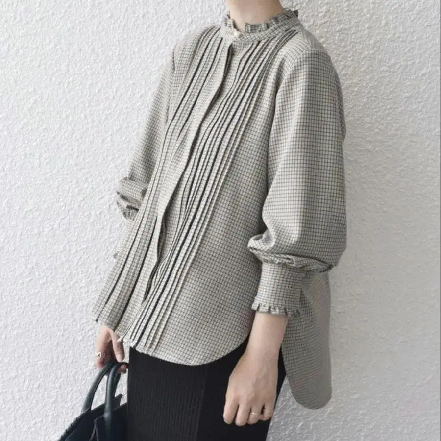 차분한 컬러의 무지 체크 원단에 사다리 레이스를 더한 1장 블라우스입니다. 목 부분, 소매의 프릴과 진주 모티브 버튼이 포인트입니다.