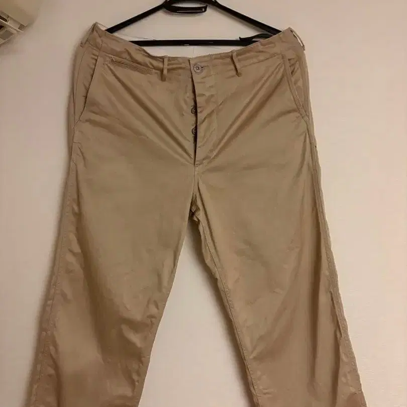 1942년형 밀리터리 치노를 재현한 모델입니다. 겨드랑이, 가랑이, 엉덩이 부분이 2본침 롤링 봉제 사양으로 되어 있습니다. 당시 이 사양으로 봉제할 수 있는 미싱 대수가 한정되어 있었기 때문에 빈티지에서도 쪼개기 봉제 사양의 치노 팬츠에 비해 수가 적은 것 같습니다. 프론트는 U.S. ARMY 각인이 들어간 메탈 버튼, 포켓 입구는 높은 봉제 기술을 요하는 양옥 테두리 사양입니다. 밑위가 깊고 넉넉한 와이드 실루엣입니다.