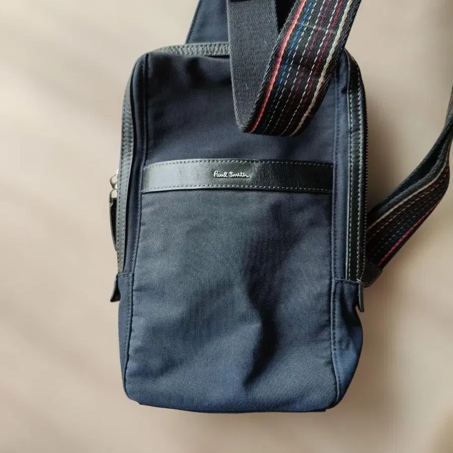 인기 폴스미스 바디백 멀티 스트라이프 실버 로고 네이비