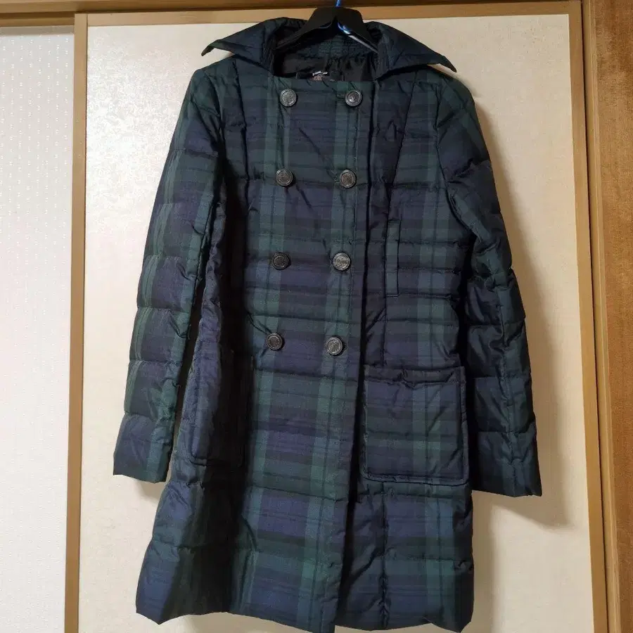 더블 브레스트 다운 자켓 후드 부착 그린 계열 체크