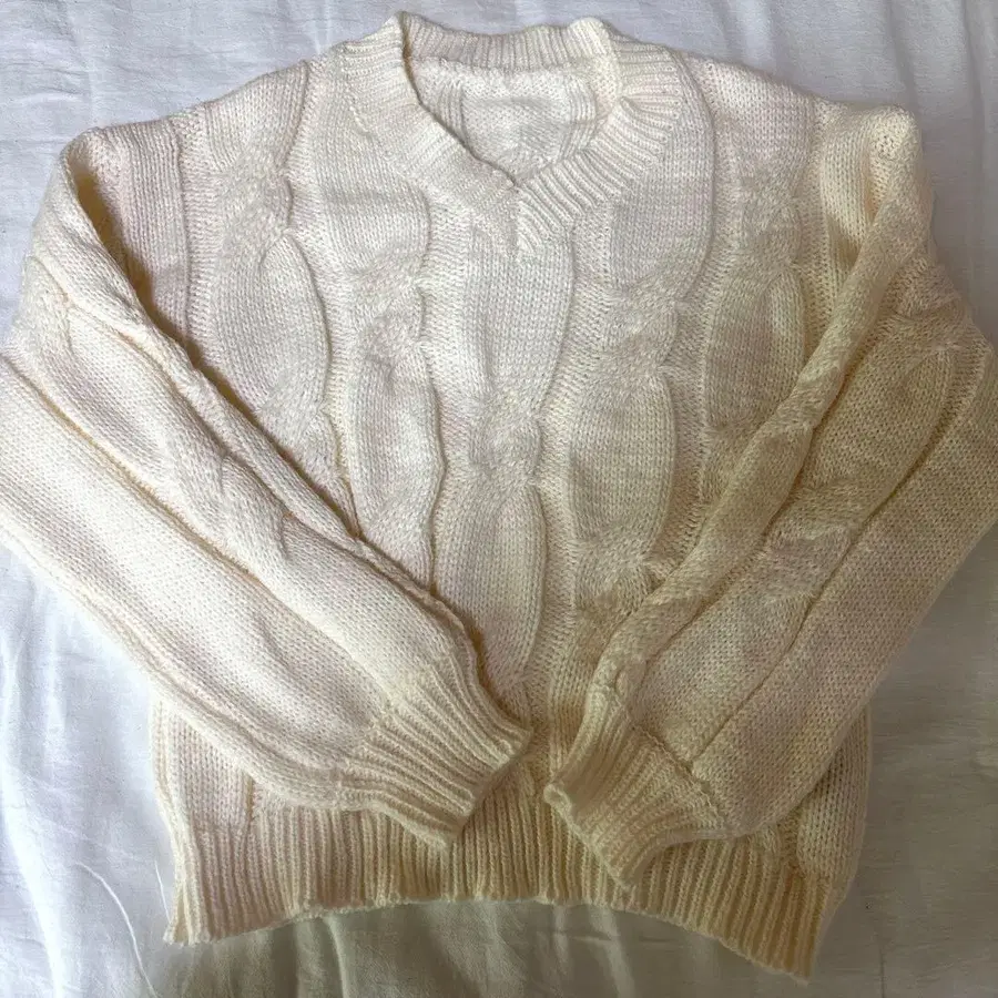 크림색 케이블 니트 V넥 스웨터