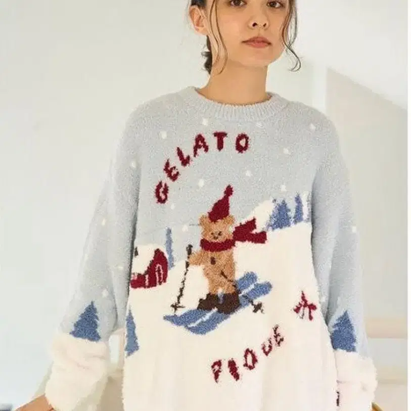 [ HOLIDAY 스키를 즐기는 베어를 대담하게 그린 풀오버 ]