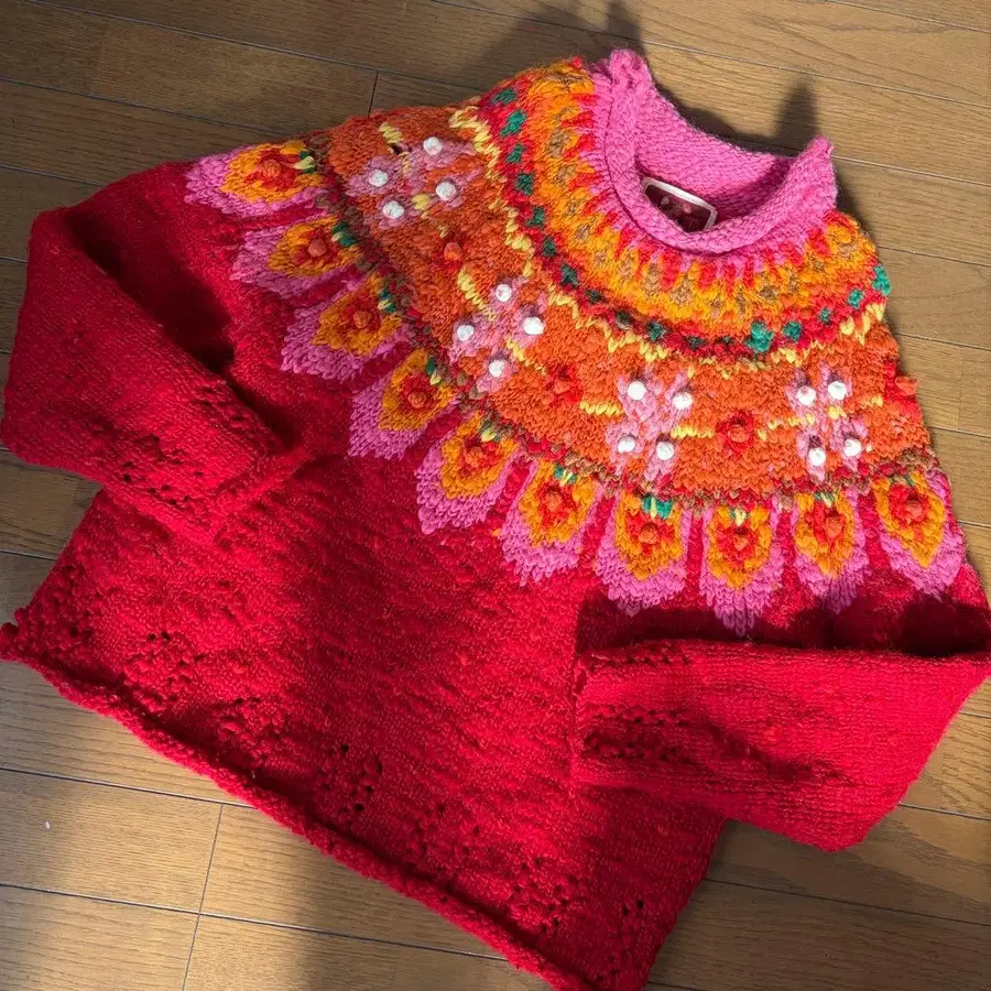 자동 번역되었어요. 원문보기컬러풀한 무늬와 폼폼이 특징인 두꺼운 원단의 울 스웨터.