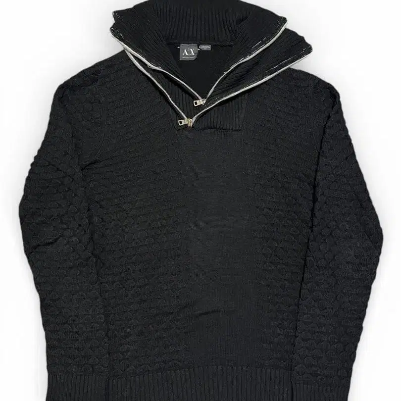 입체감 있는 편직 패턴과 레이어드 사양의 하프 지퍼 디자인이 인상적인 니트탑입니다.