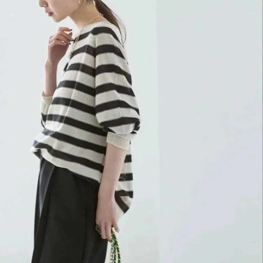 이사로 인해 미니멀리스트가 되어야 해서 판매를 결정했습니다. 두 번 정도 짧은 시간 착용했습니다. 홈 클리닝 완료했습니다. 정가: 14,300원 색상: 블랙 x 베이지 사이즈: 프리 마음에 드셨으면 좋겠습니다 ☺️ [ 상품 설명 ] 여성스럽게 입을 수 있다고 호평! 약간 빅 사이즈감과 와이드 피치의 보더가 신선한 니트. 몸이 편안하게 감싸는 여유감과 넓게 파인 넥라인은 캐주얼하지 않으면서도, 적당히 여성스러움을 돋보이게 합니다. 일본 국내 공장에서 홀가먼트 편직되어, 착용 시의 절묘한 뉘앙스는 다른 곳에서는 찾을 수 없는 아이템입니다. 종이를 실로 편직한 원단을 사용하여 통기성과 흡수, 속건성이 뛰어나며, 또한 집에서 세탁 가능한 이지케어로 데일리로 사용하기에 최적입니다. 솔기가 없어 거칠지 않고 신축성이 뛰어나며, 또한 안쪽으로 짜인 편직이 피부에 부드러운 니트입니다. 심플하게 데님이나 팬츠와 조합하거나, 맥시 스커트로 릴랙스한 스타일링도 추천합니다. ********************** 비침: 있음 안감: 없음 신축성: 있음 광택감: 없음 원단 두께: 얇은 소재 ********************** [ 스태프 착용 댓글 ] 나이 30대/신장: 161cm/체형: 보통/평소 사이즈: 36 /착용 사이즈: 프리 사이즈감: 몸에서 떨어지는 실루엣 & 힙을 가리는 롱 기장의 넉넉한 사이즈감.소재감: 페이퍼얀을 MIX한 드라이 터치의 가볍고 부드러운 질감. 봄/여름 시즌에 어울리는 청량감 있는 얇은 니트 원단입니다.착용감: 따뜻한 시즌을 쾌적하게 보낼 수 있는, 피부에 닿는 느낌이 가벼운 에어리한 착용감. ********************** ※ 블랙과 화이트의 스트라이프 디자인의 벌룬 슬리브 니트. - 색상: 블랙과 화이트 스트라이프 - 스타일: 벌룬 슬리브 - 소재: 니트 - 소매 길이: 긴팔 - 핏: 릴랙스 핏 방문해 주셔서 감사합니다.