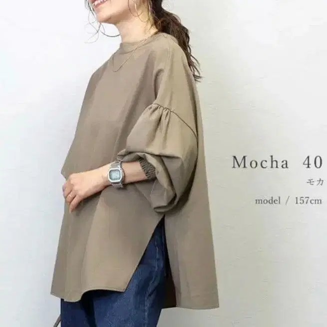 벌룬 슬리브의 모카색 셔츠, 뒷면에 단추가 달린 디자인.