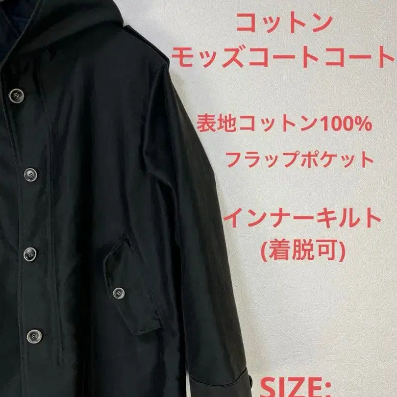 ○ 특징 모즈 코트, 코튼 100%, 플랩 포켓, 밑단 드로 코드 포함, 깊은 후드, 일본제, 블랙