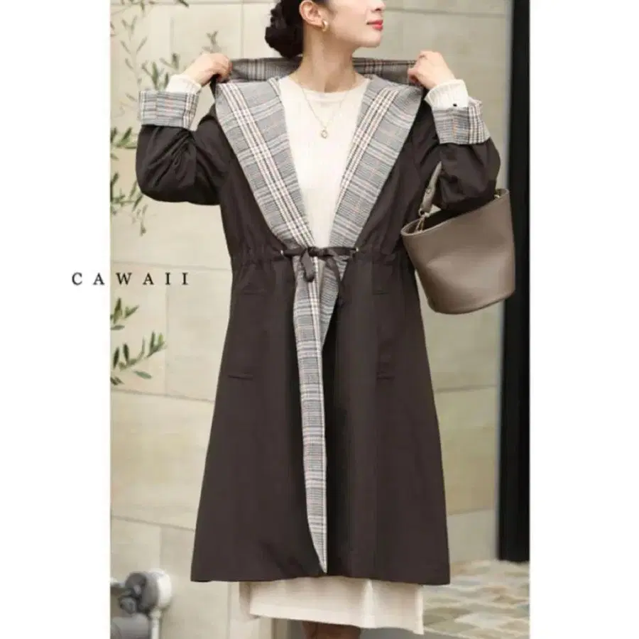 CAWAII 체크가 귀여운 라인의 후드 부착 라이트 코트