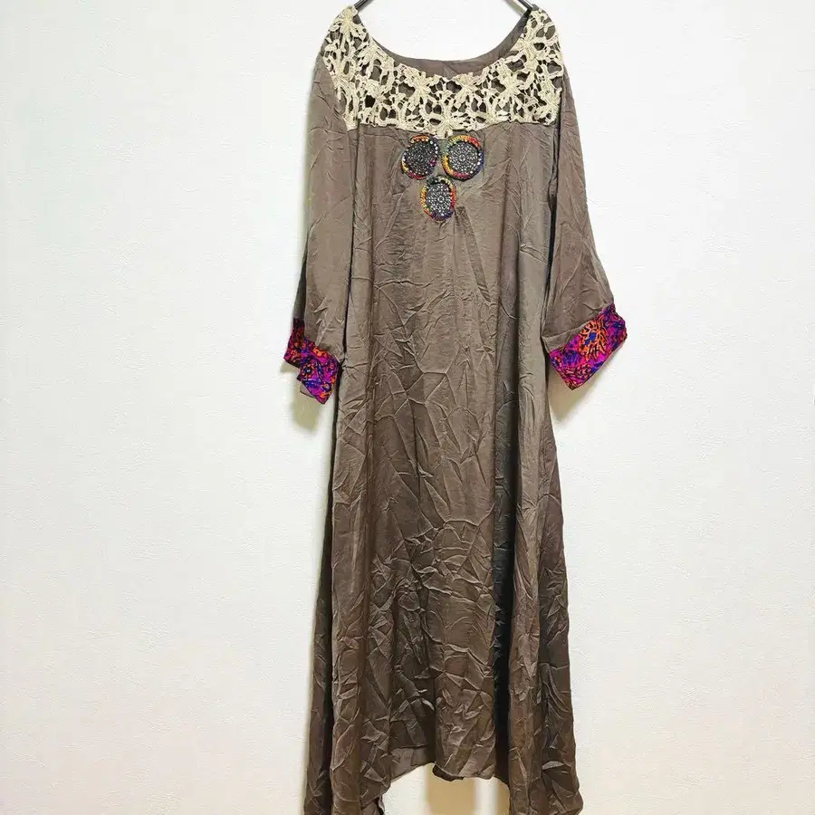 자동 번역되었어요. 원문보기레이스 장식과 컬러풀한 비즈가 특징인 브라운 롱 스커트.